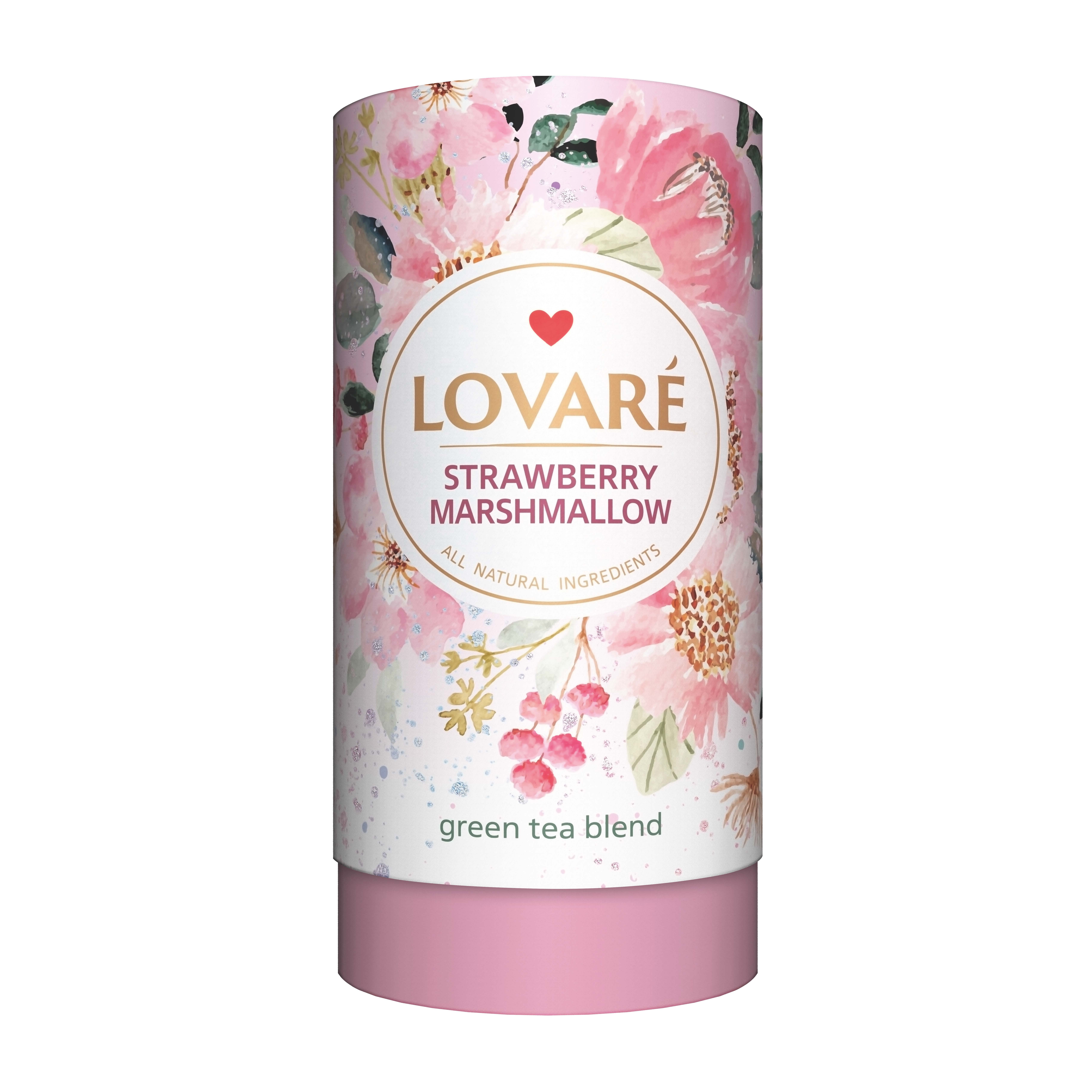 Вкусная чайная смесь Lovare Strawberry Marshmallow - китайский зеленый чай, кусочки клубники, лепестки василька. Натуральный ароматизатор «Клубника».