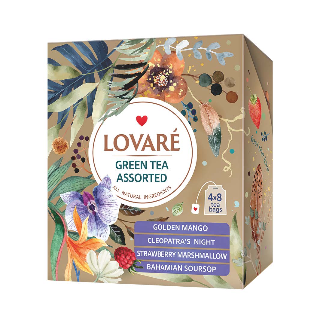 Lovare Ассорти – это коробка из 32 пакетиков чая, разделенных на 4 группы: Золотой Манго, Ночь Клеопатры, Багамский саусеп и Клубничный маршмеллоу.